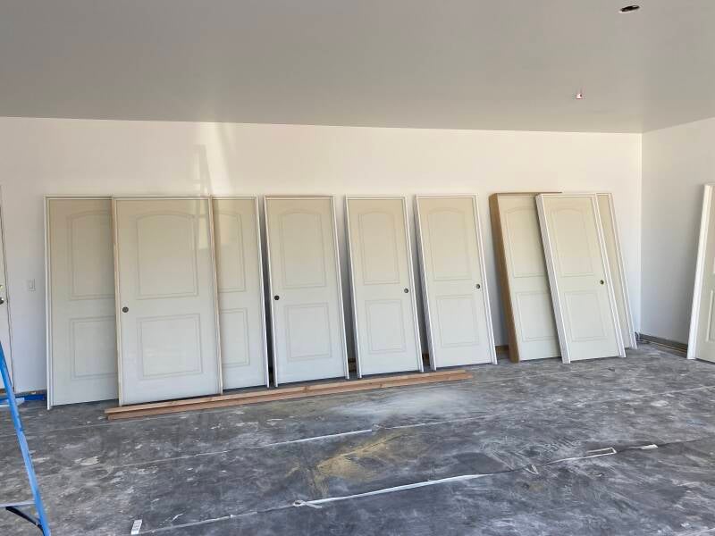 In order to demonstrate our fast turn around on merchandise, our Valley Center client couldn't wait 2 weeks for his interior door package (the typical lead time for interior doors), so we turned up the heat and got it done for him in 2 days. The interior solid core door package consisted of eleven pre-hung interior doors, one pre-hung 20 minute fire rated garage door and 2 bi-pass mirrored closet doors. He signed our contract on Monday (10/21/22) and delivered a 50% deposit to us. We then ordered all the door slabs and mill work from our supplier just prior to end of day Monday and received our supplies the following morning with the exception of the fire door and mirrored doors. Our team worked hard and were able to fabricate and complete all the pre-hung interior doors that day. All the interior doors were then delivered to our client's job site on Wednesday the 23rd while the fire door took a bit longer and was delivered on 12/1/22. We were able to make a few recommendations that saved our client from ordering the wrong swings. As an example, the plans showed the master toilet door swinging in. The reality is that this door would have hit the toilet, so we recommended changing the swing from a RH to LF out-swing. Additionally, the master bath door was showing the wrong swing on the plans, so we corrected that swing from a LH to RH. So, in this real case example, our recommendations saved our client the headache and cost of fixing these two door swings on his own.