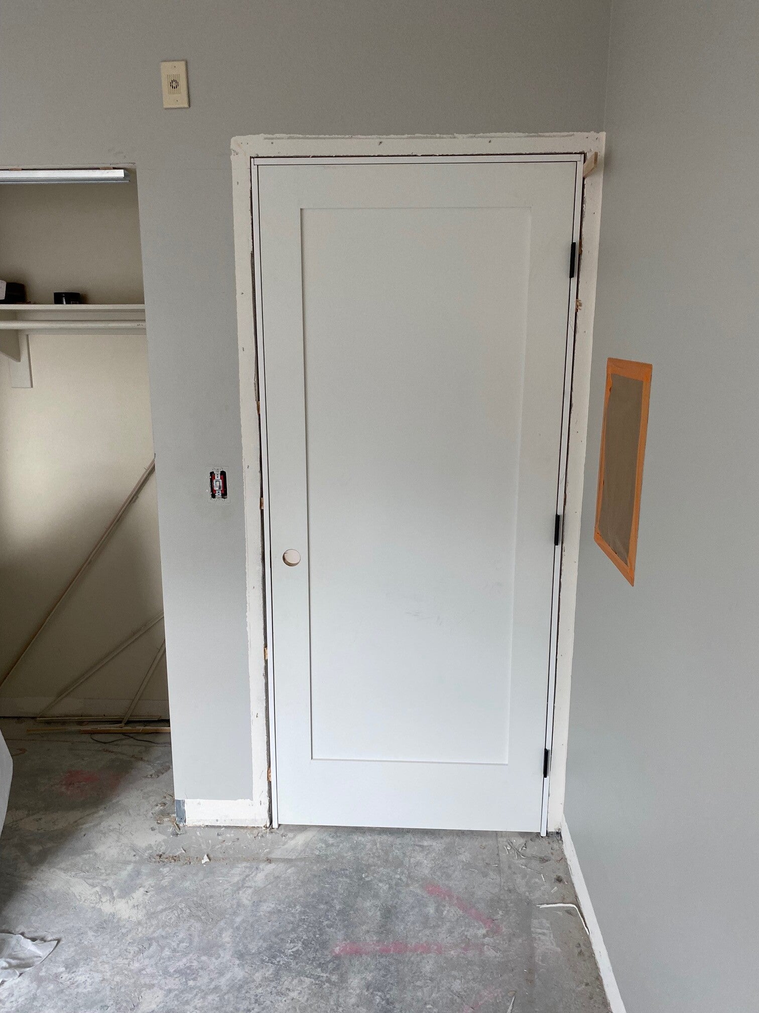 In some cases, our clients need more than what is commonly offered by our suppliers, As an example, one of our RSF clients was looking for a custom baseboard for their guest house, so we sketched a design and they went with it. We were able to fabricate the baseboard and 3/4" bull-nose corners out of poplar wood. Other customization as pictured show kerfed polar jambs, modified smaller utility doors, hollow core metal utility door and custom smooth panel on one side of a 2/8 x 8/0 door. The picture shows routering one side flat in order to glue the 1/4" panel.